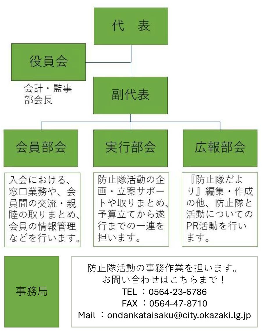 岡崎市地球温暖化防止隊は、役員として代表1名、副代表1名、部会長5名以内、会計1名、監事2名で構成しております。現時点では、会員部会・実行部会・広報部会の3部会で組織されています。