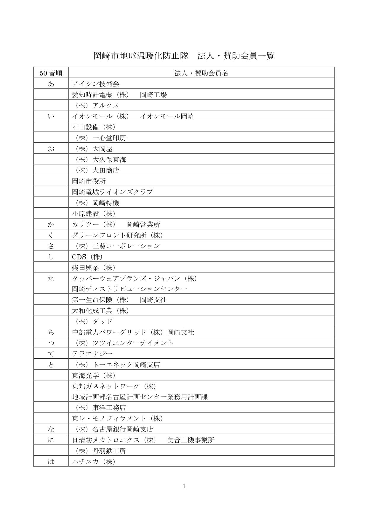 岡崎市地球温暖化防止隊 法人・賛助会員一覧